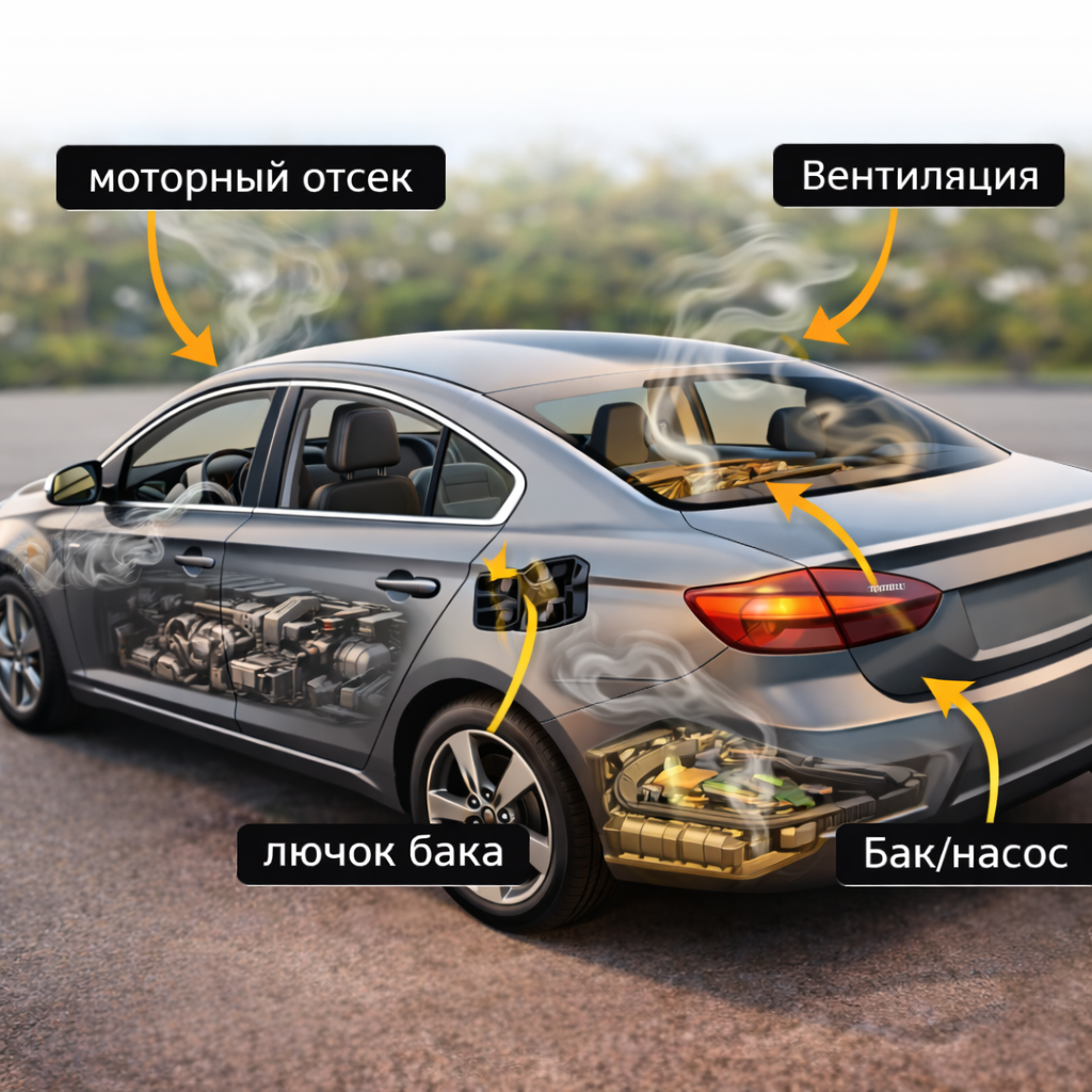 Регулярная проверка крышки бензобака, багажника и топливной системы помогает не доводить ситуацию до запаха в салоне.