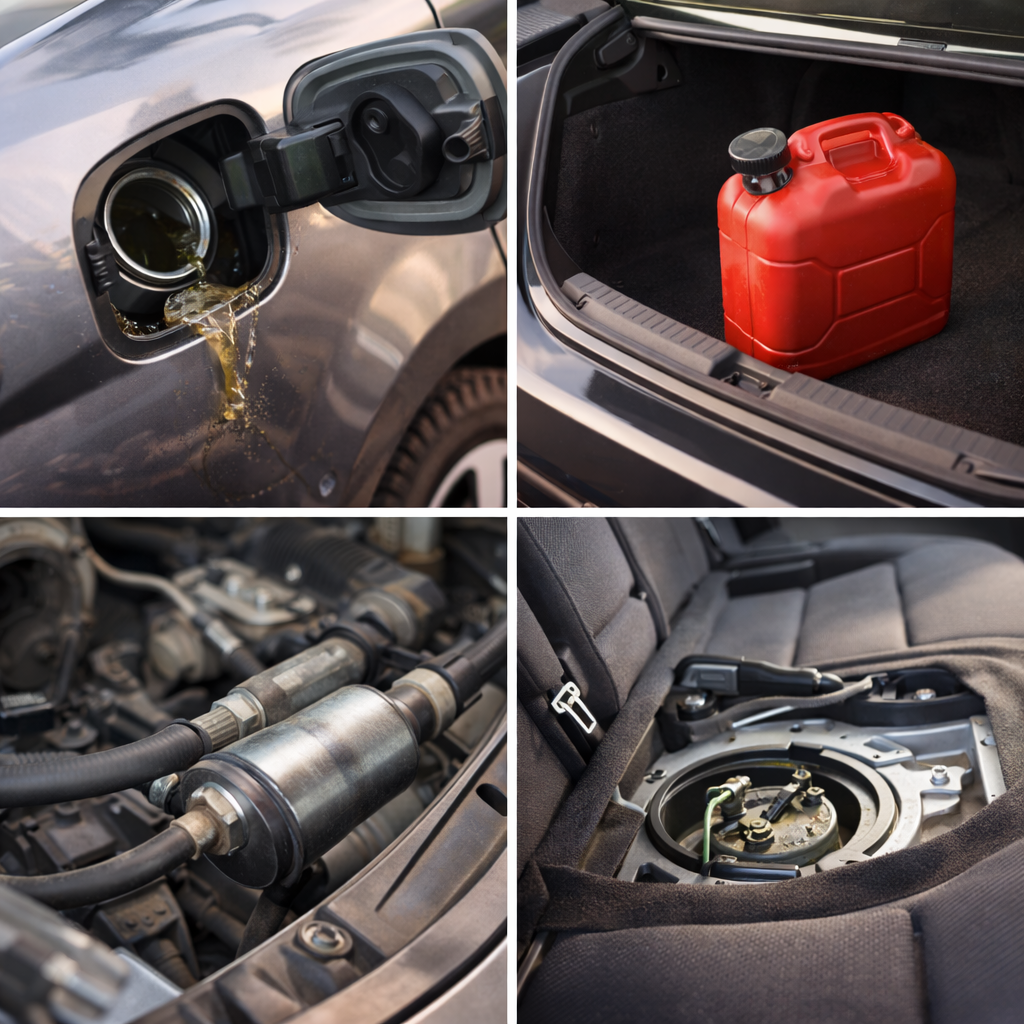 Иногда бензин попадает туда незаметно. Особенно если в багажнике перевозили канистру, садовый инструмент, тряпку или пластиковую воронку. Если запах в машине держится, а вы уже проверили явные зоны — обязательно осмотрите скрытые ниши.